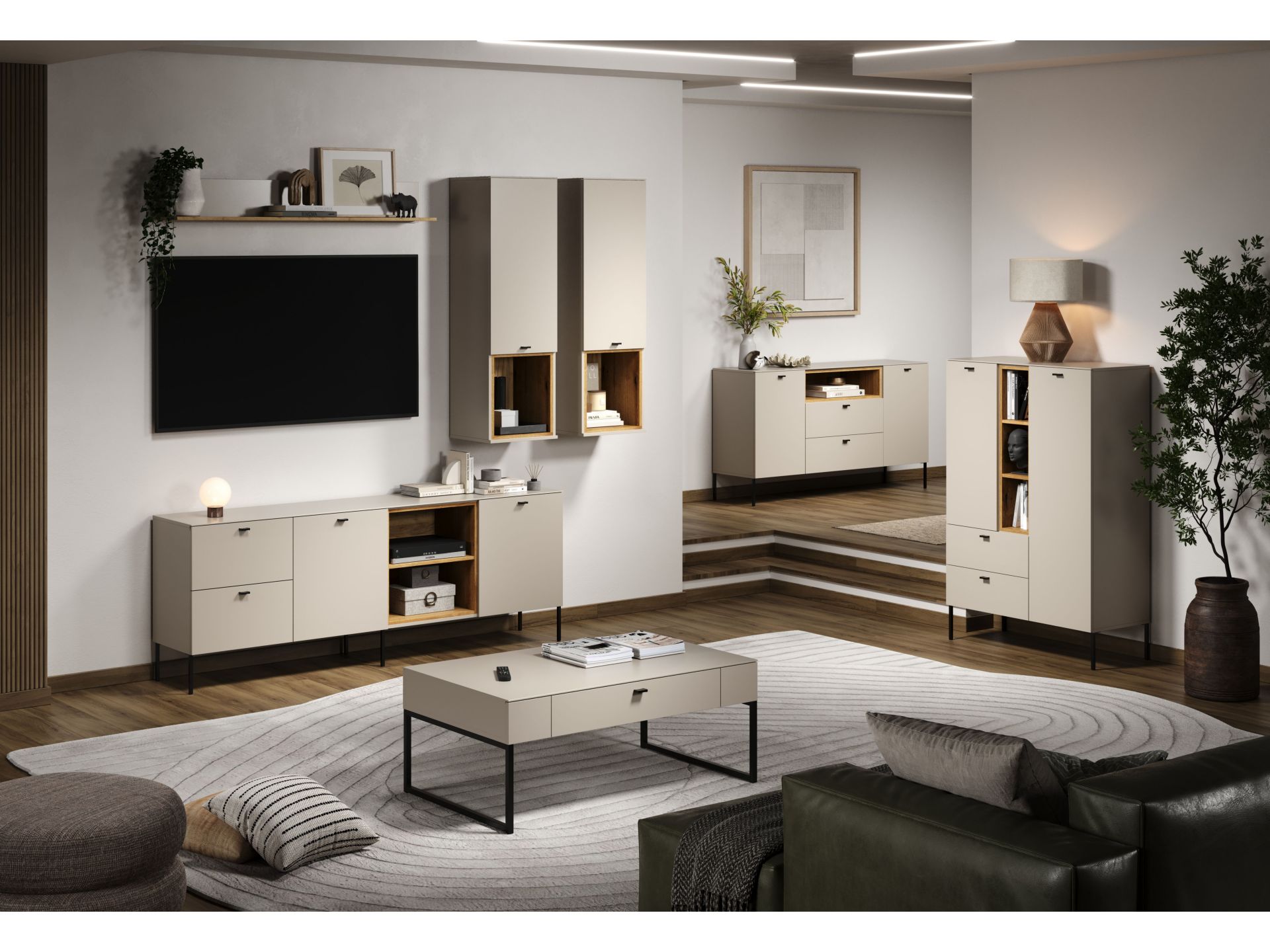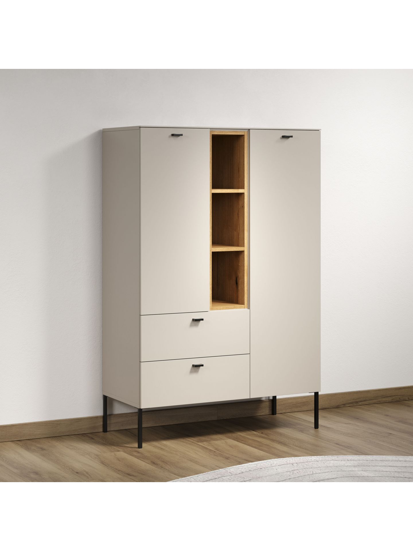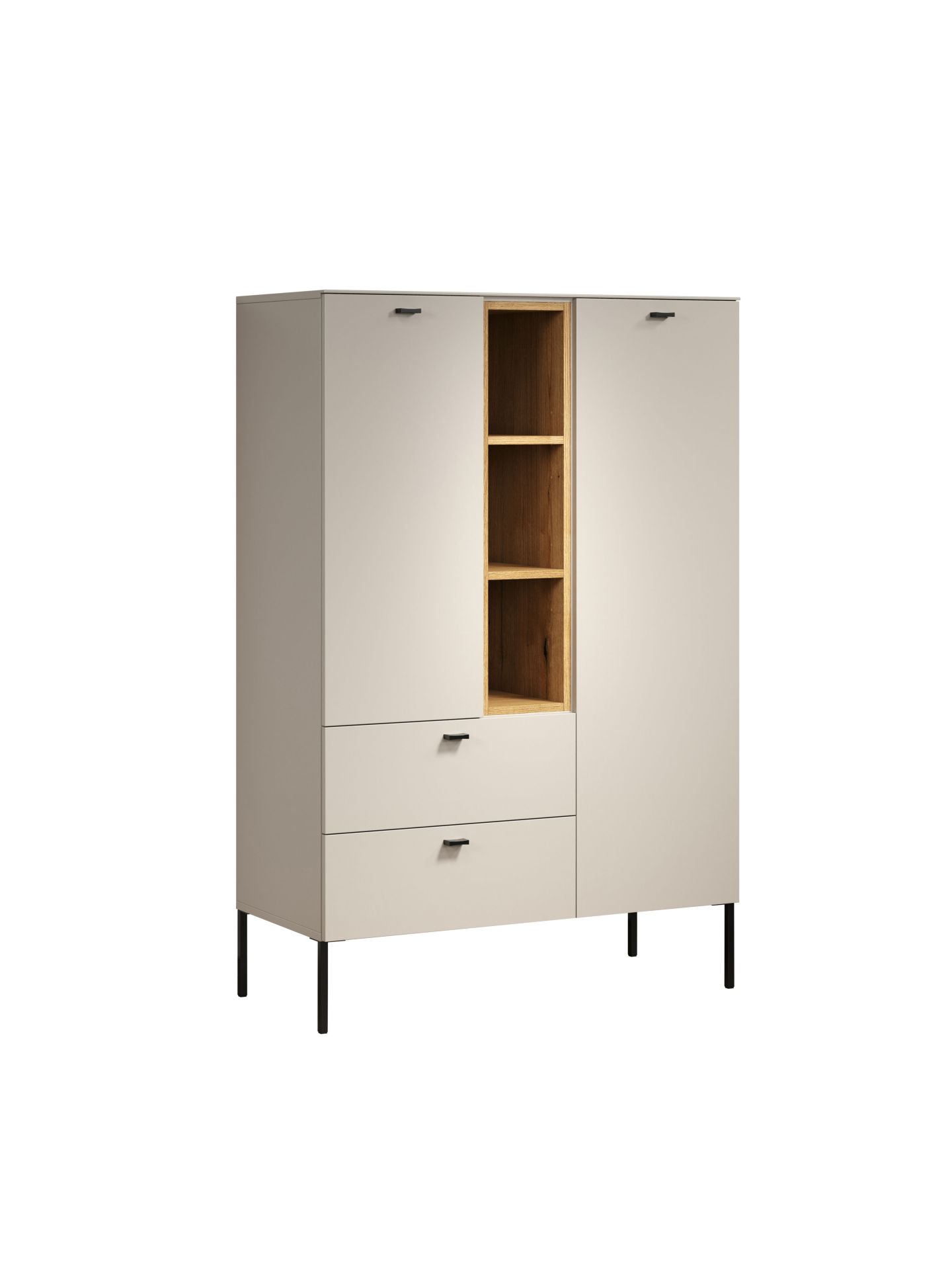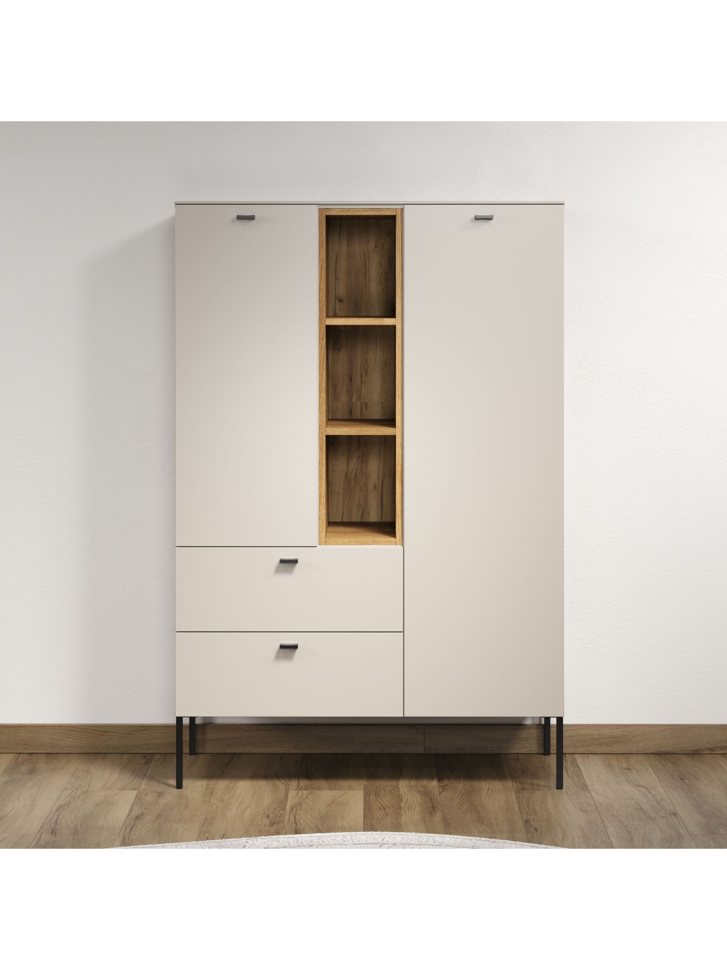 Die Wohnserie Sao Paulo überzeugt durch eine moderne, minimalistische Formsprache, die sich harmonisch in verschiedenste Wohnstile einfügt. Die Möbelstücke der Serie präsentieren sich in einem matten, hellen Sandton, kombiniert mit offenen Regalelementen in warmem Eichenholzdekor. Dieser Materialmix schafft ein wohnliches, zugleich edles Ambiente. Schwarze, filigrane Metallfüße und -griffe setzen moderne Akzente und sorgen für einen leichten, schwebenden Look. Neben der ansprechenden Optik punktet Sao Paulo mit sanft schließenden Türen und Schubladen dank Soft-Close-Funktion.