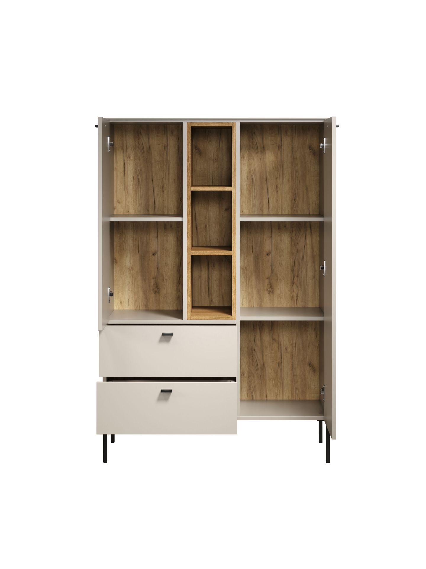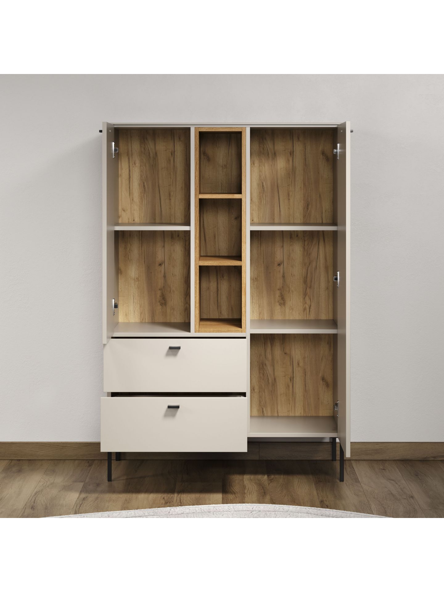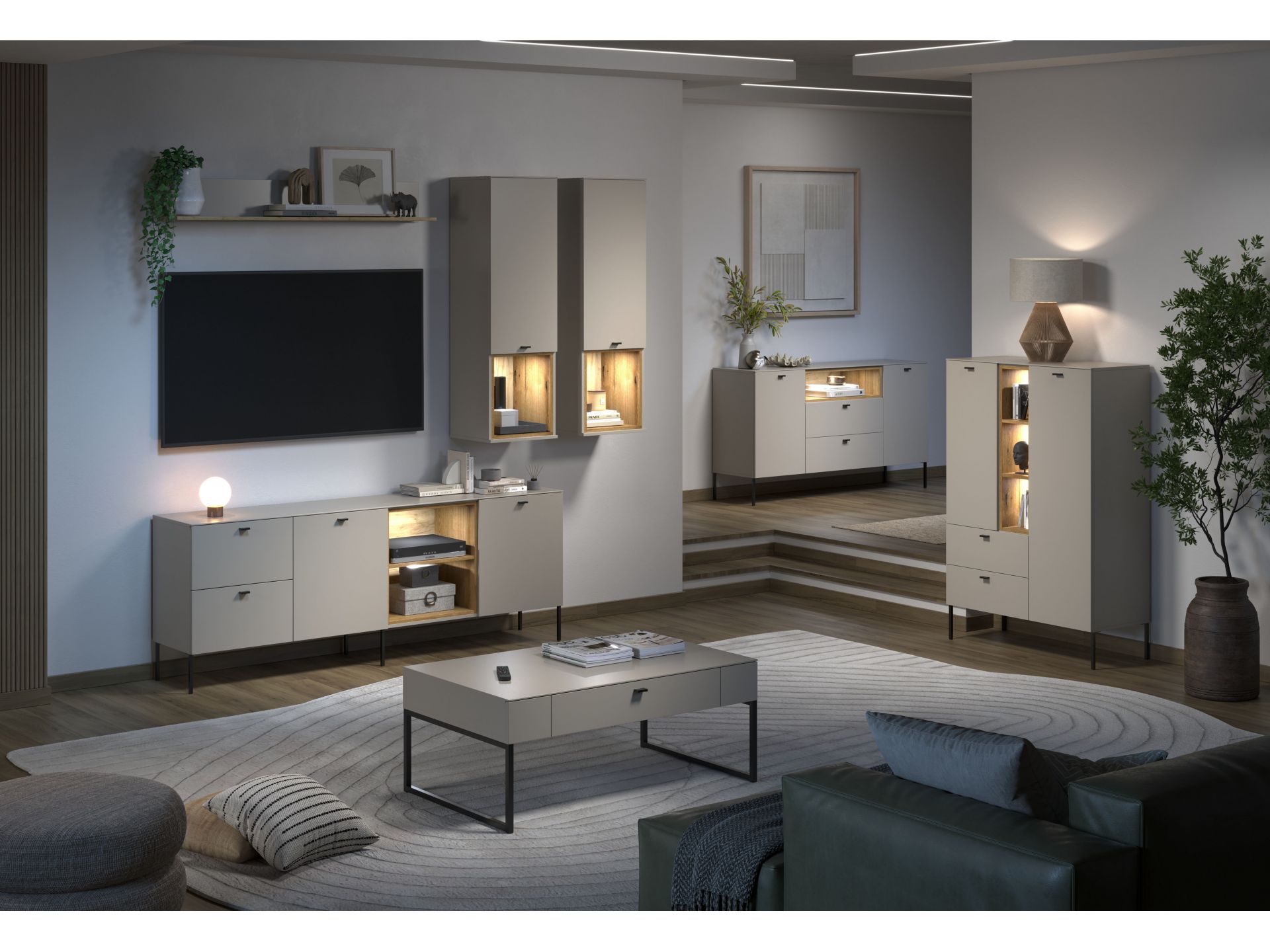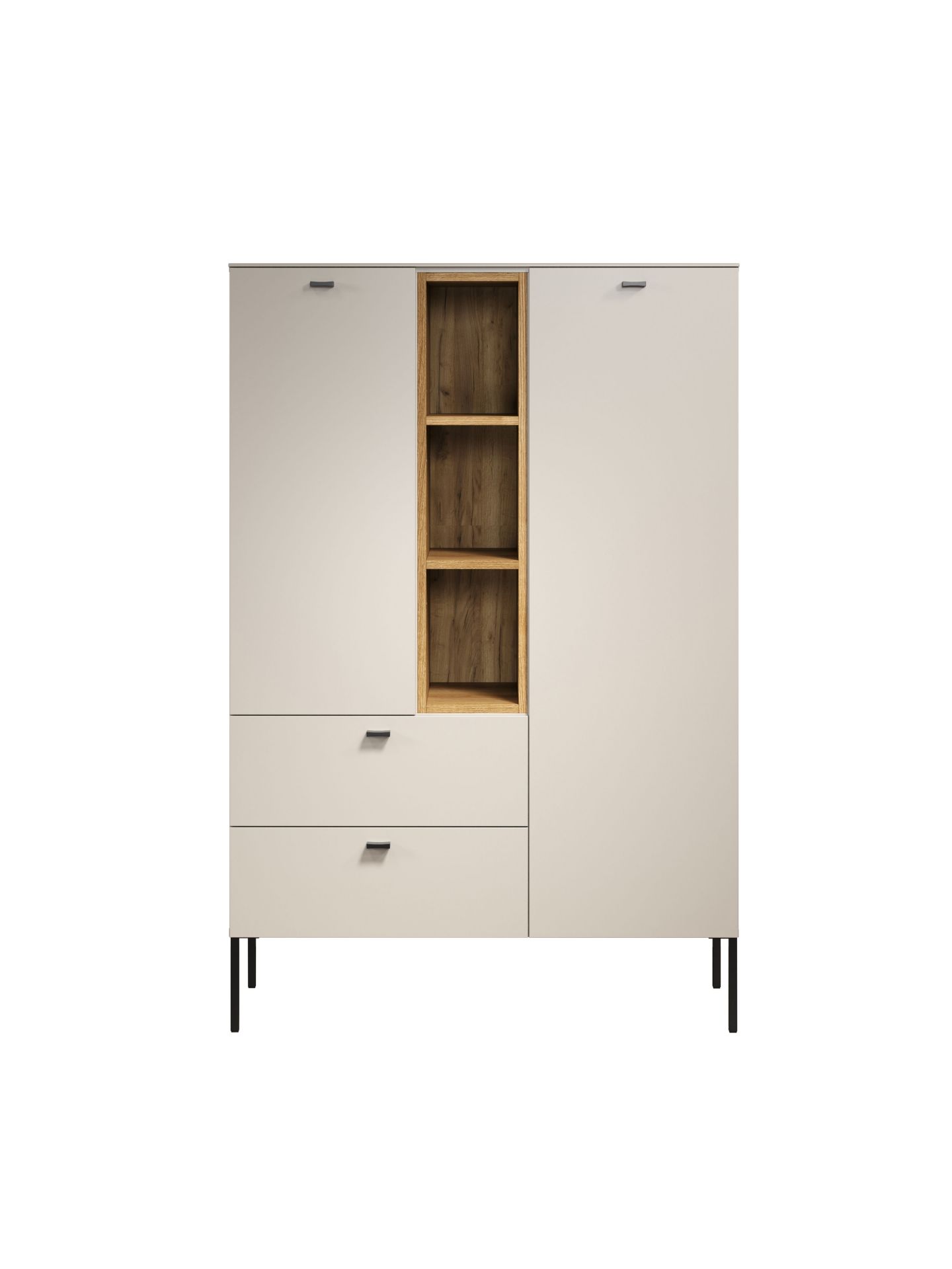 Die Wohnserie Sao Paulo überzeugt durch eine moderne, minimalistische Formsprache, die sich harmonisch in verschiedenste Wohnstile einfügt. Die Möbelstücke der Serie präsentieren sich in einem matten, hellen Sandton, kombiniert mit offenen Regalelementen in warmem Eichenholzdekor. Dieser Materialmix schafft ein wohnliches, zugleich edles Ambiente. Schwarze, filigrane Metallfüße und -griffe setzen moderne Akzente und sorgen für einen leichten, schwebenden Look. Neben der ansprechenden Optik punktet Sao Paulo mit sanft schließenden Türen und Schubladen dank Soft-Close-Funktion.