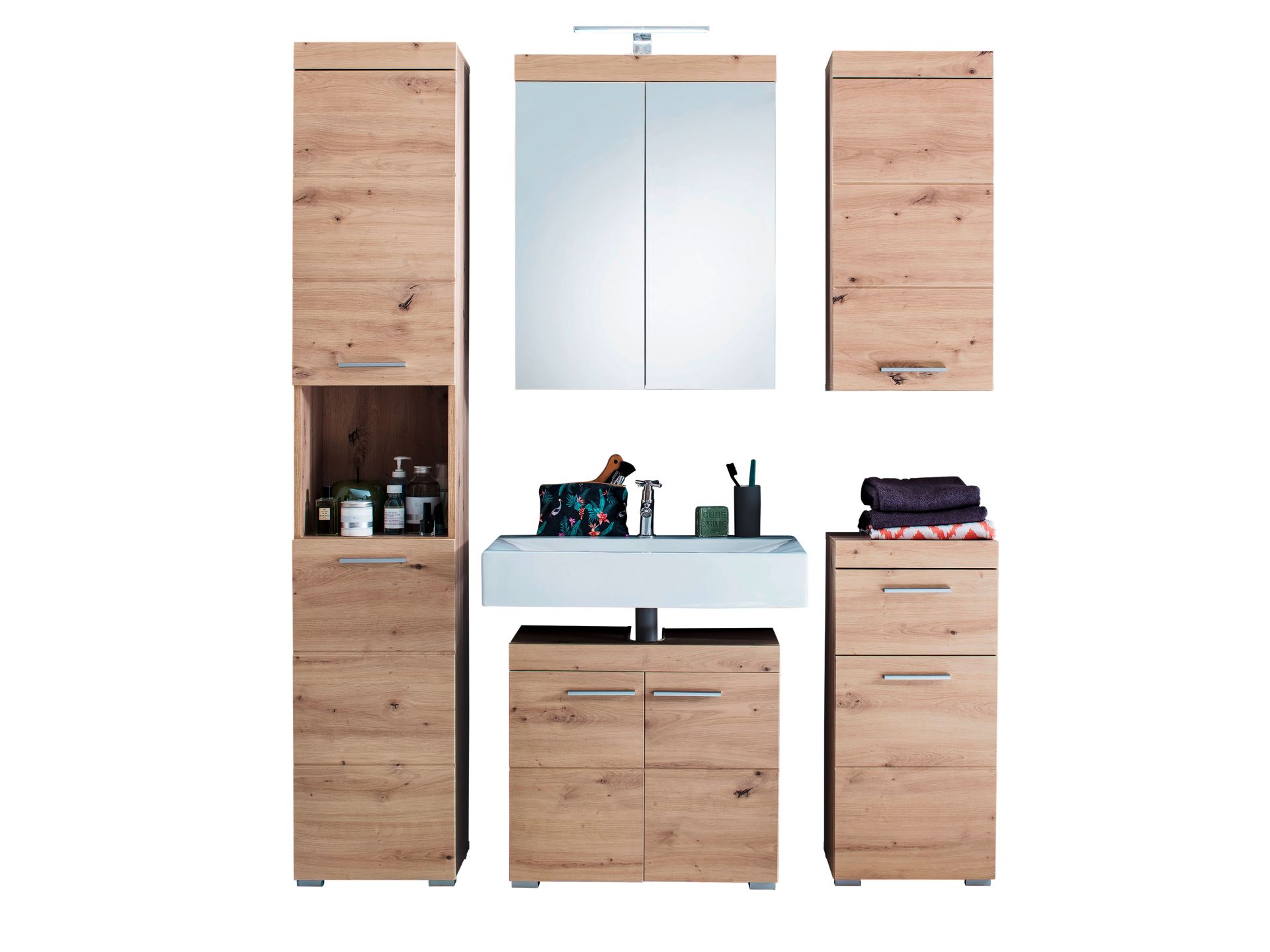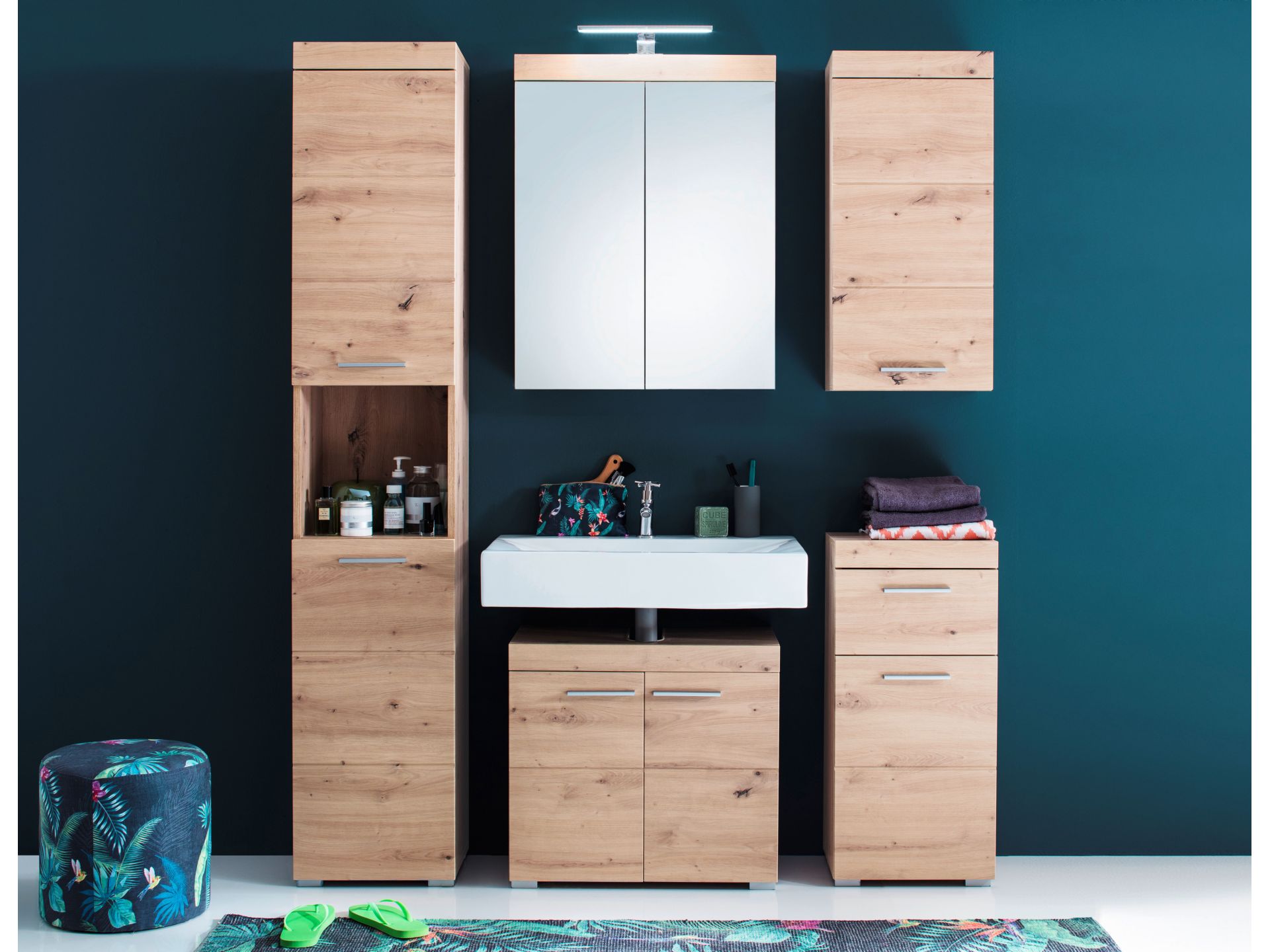 Eine attraktive Lösung für jedes Badezimmer, in dem es noch an Aufbewahrungsmöglichkeiten fehlt, bietet dir die nassraumgeeignete Bad-Kombi "Amanda"nation Inkl. Beleuchtung von trendteam in praktischer nassraumgeeigneter Aufmachung. Die eingesetze Dekorfolie in Verbindung mit Melamin verleiht der Oberfläche Langlebigkeit. Das Design kennzeichnet der Korpus im Asteiche Dekor, wodurch es fabelhaft zu deinem übrigen Mobiliar passt. Die Farbgebung wird durch die silberfarbenen Griffe komplettiert. Dieser Artikel ist Bestandteil eines Sets.