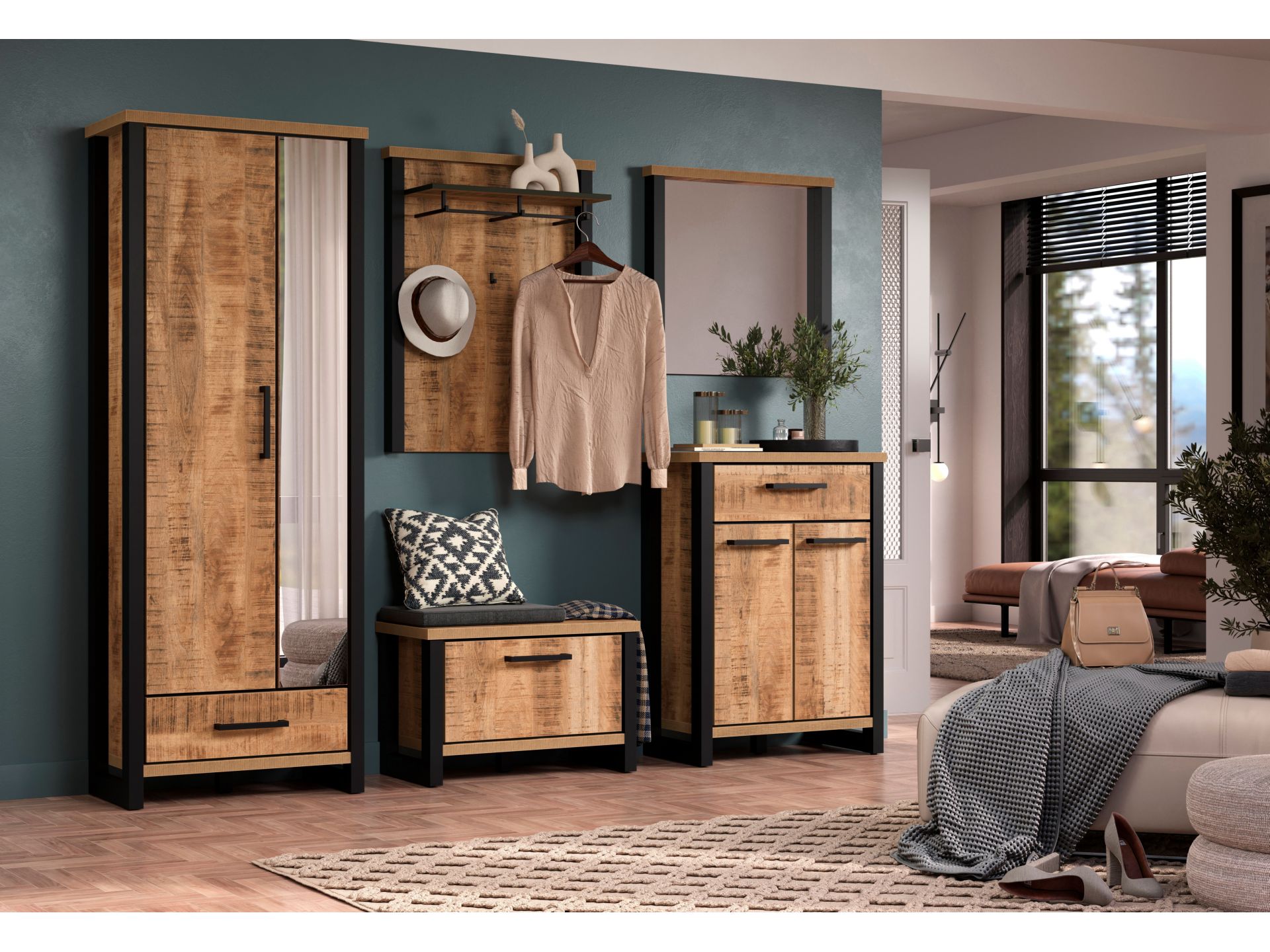 Die Fronten in authentischer Mangoholz-Optik sorgen für eine wohnliche Atmosphäre, während die schwarz abgesetzten Rahmen und Griffe einen Hauch von Industrial Design einbringen. Jedes Element wirkt hochwertig und durchdacht – von der schmalen Garderobe über das funktionale Schuhbank-Modul bis hin zum großzügigen Spiegel.