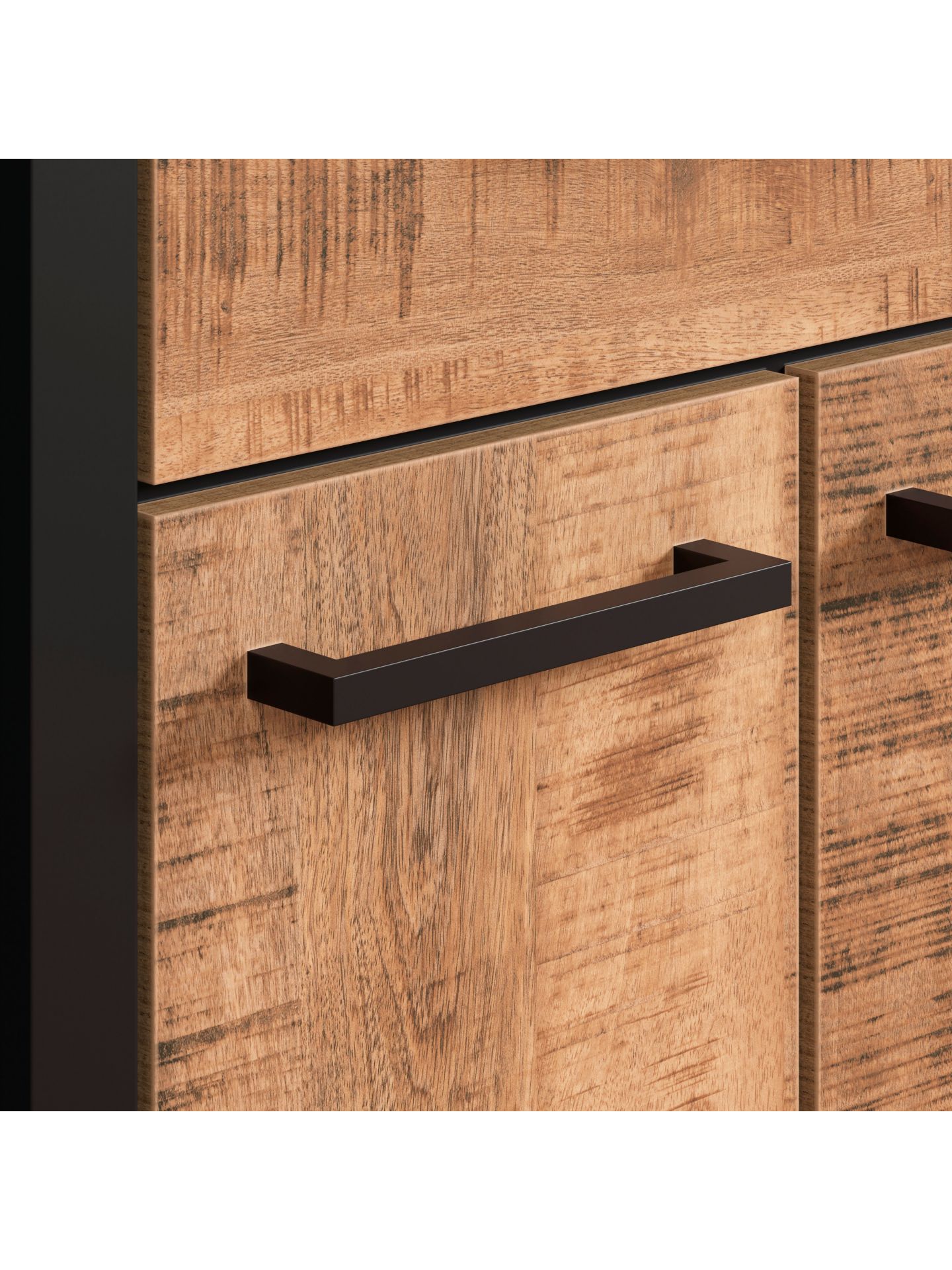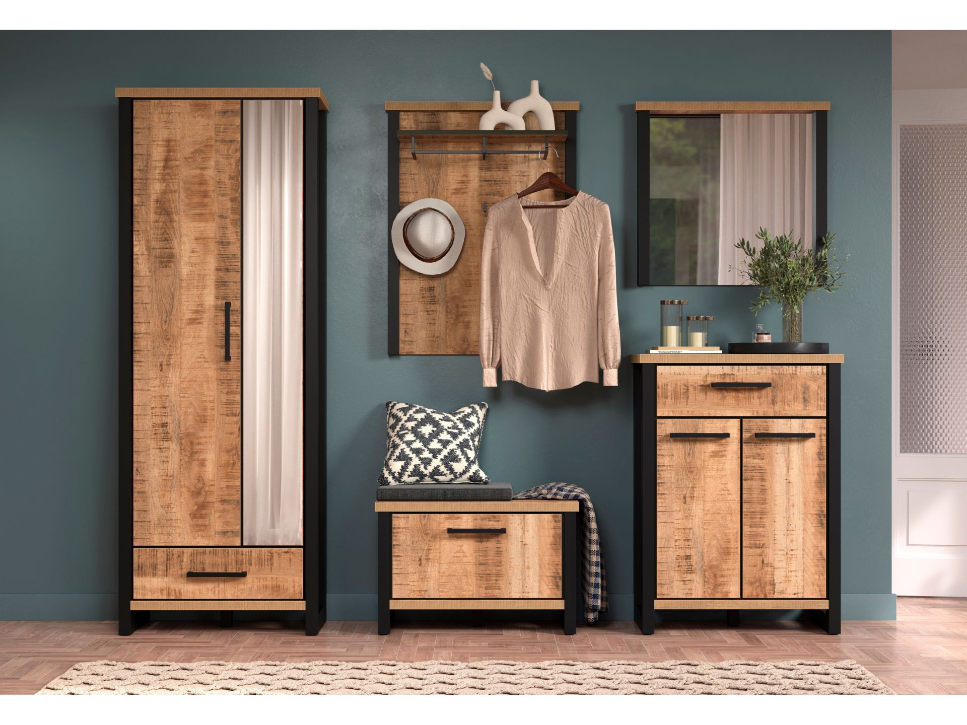 Die Fronten in authentischer Mangoholz-Optik sorgen für eine wohnliche Atmosphäre, während die schwarz abgesetzten Rahmen und Griffe einen Hauch von Industrial Design einbringen. Jedes Element wirkt hochwertig und durchdacht – von der schmalen Garderobe über das funktionale Schuhbank-Modul bis hin zum großzügigen Spiegel.