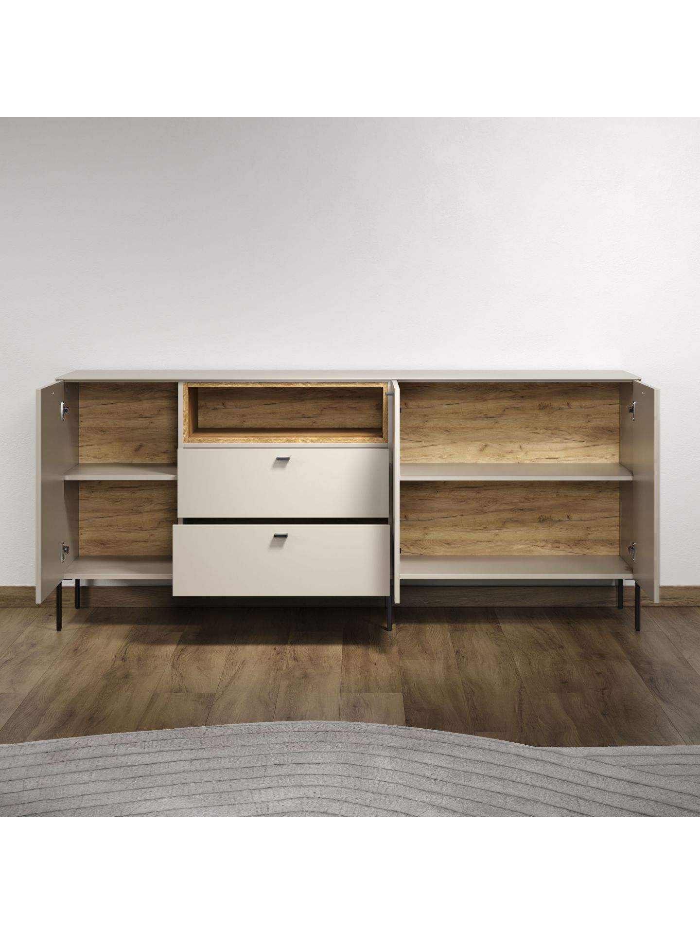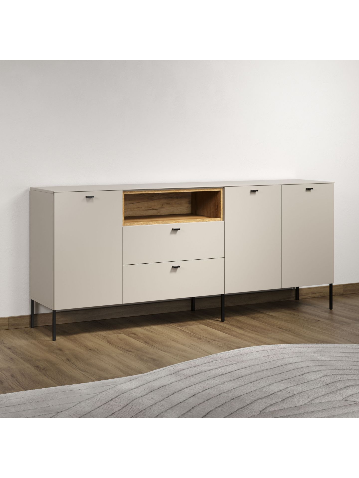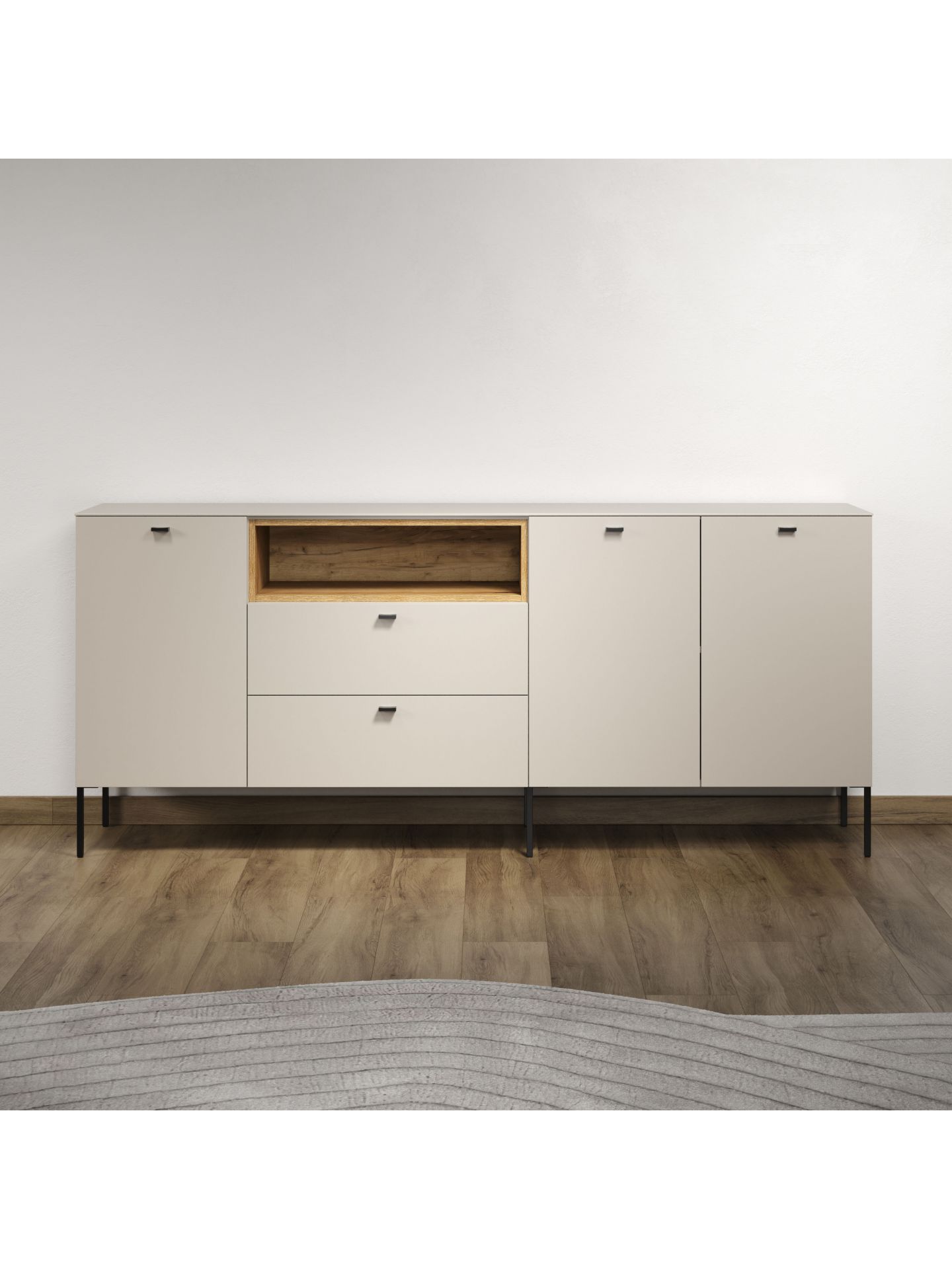 Die Wohnserie Sao Paulo überzeugt durch eine moderne, minimalistische Formsprache, die sich harmonisch in verschiedenste Wohnstile einfügt. Die Möbelstücke der Serie präsentieren sich in einem matten, hellen Sandton, kombiniert mit offenen Regalelementen in warmem Eichenholzdekor. Dieser Materialmix schafft ein wohnliches, zugleich edles Ambiente. Schwarze, filigrane Metallfüße und -griffe setzen moderne Akzente und sorgen für einen leichten, schwebenden Look. Neben der ansprechenden Optik punktet Sao Paulo mit sanft schließenden Türen und Schubladen dank Soft-Close-Funktion.
