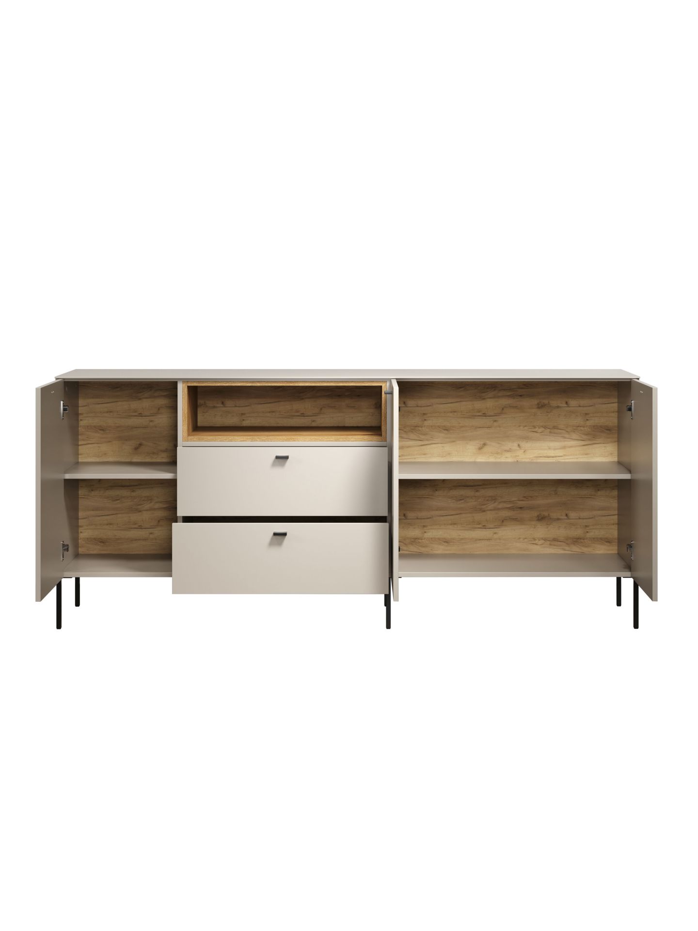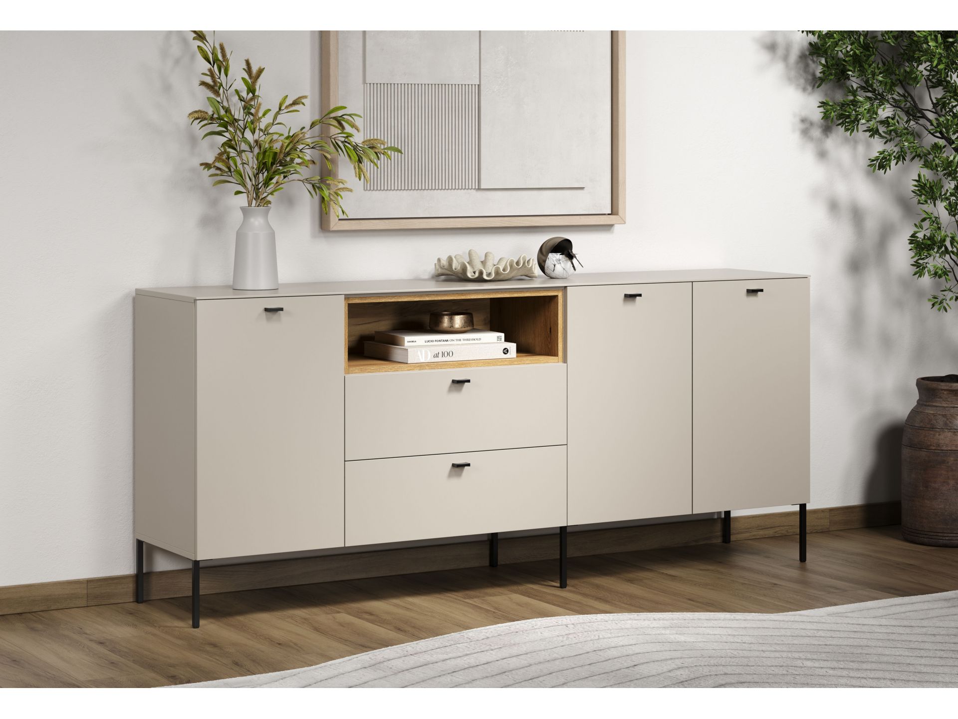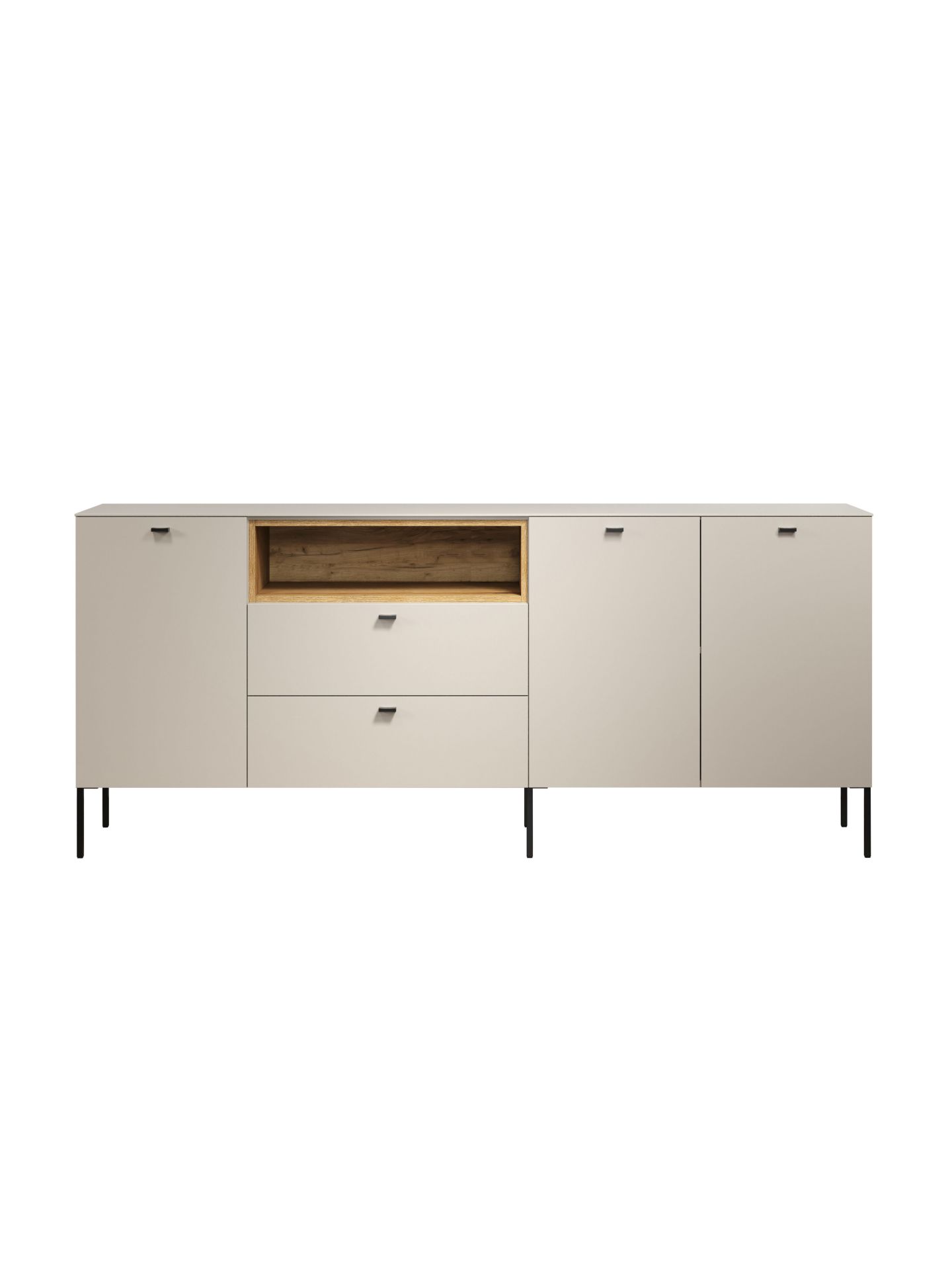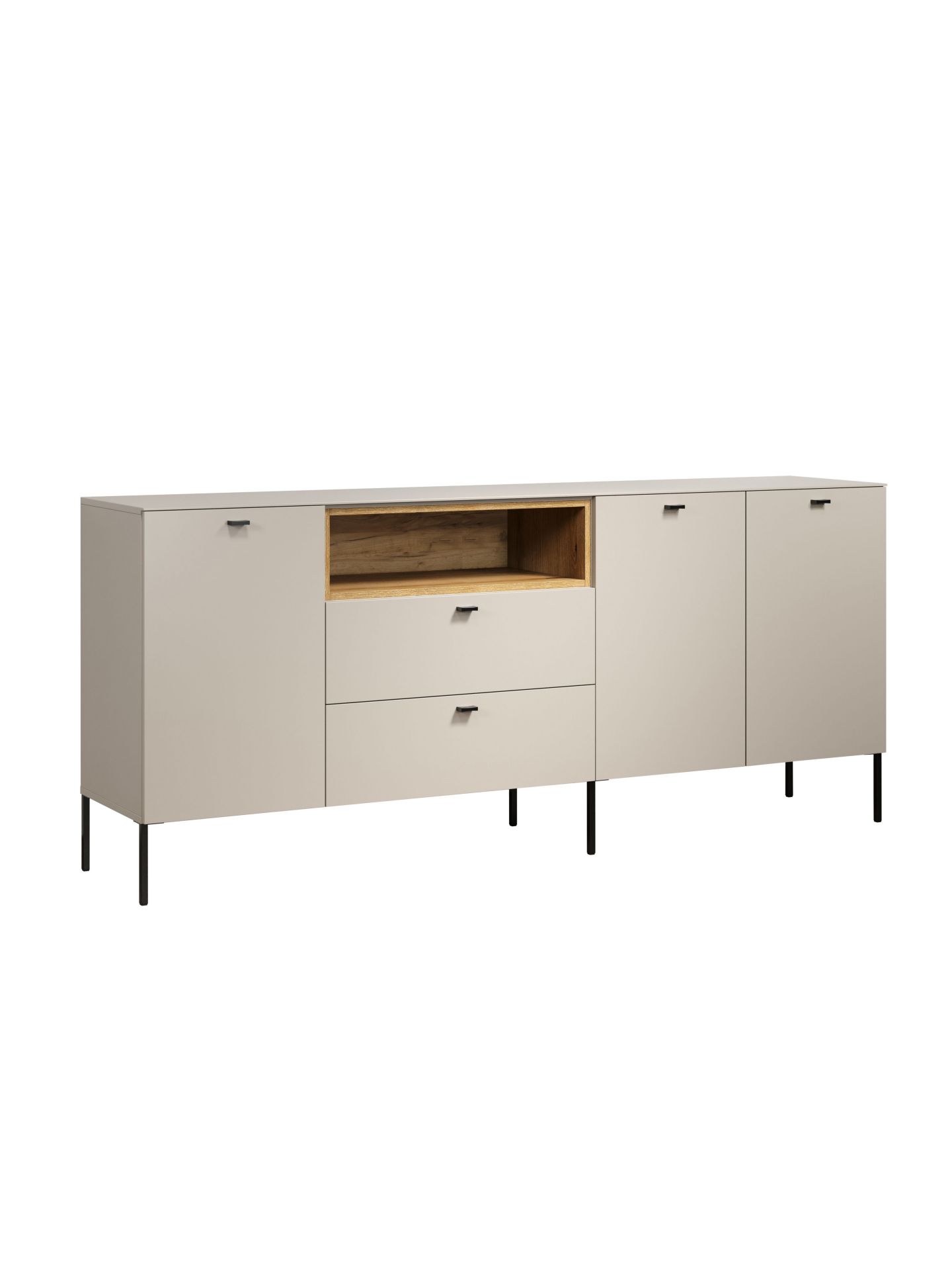 Die Wohnserie Sao Paulo überzeugt durch eine moderne, minimalistische Formsprache, die sich harmonisch in verschiedenste Wohnstile einfügt. Die Möbelstücke der Serie präsentieren sich in einem matten, hellen Sandton, kombiniert mit offenen Regalelementen in warmem Eichenholzdekor. Dieser Materialmix schafft ein wohnliches, zugleich edles Ambiente. Schwarze, filigrane Metallfüße und -griffe setzen moderne Akzente und sorgen für einen leichten, schwebenden Look. Neben der ansprechenden Optik punktet Sao Paulo mit sanft schließenden Türen und Schubladen dank Soft-Close-Funktion.