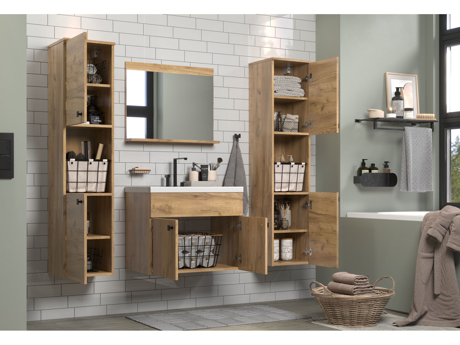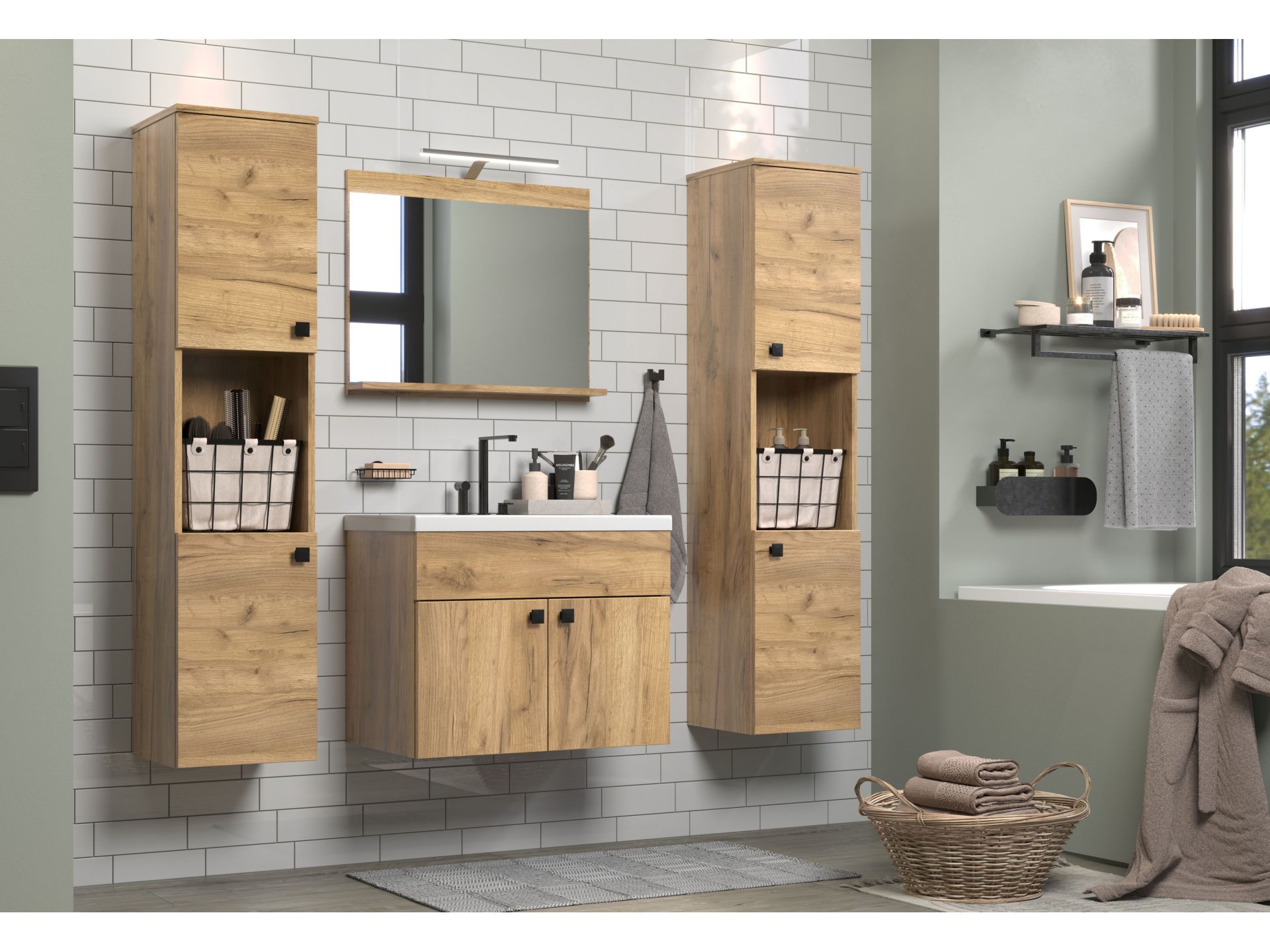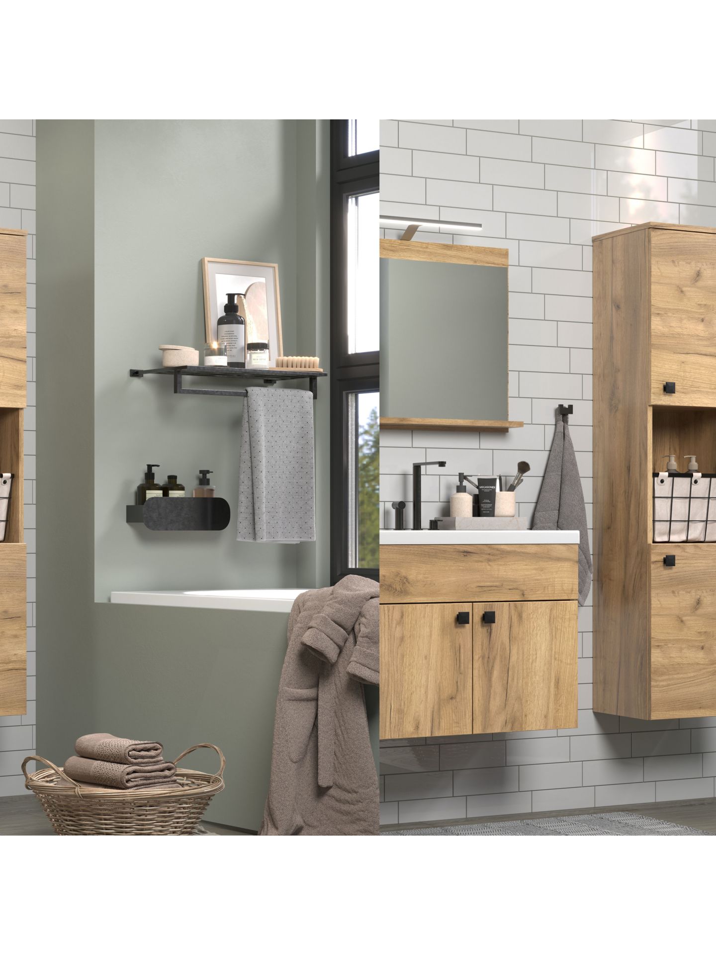 Das Badprogramm HAVEN in Holzoptik bringt ein Stück Natur ins Badezimmer. Mit seinen warmen Eiche-Dekoren und der klaren Linienführung schafft HAVEN eine Atmosphäre der Ruhe und Geborgenheit - perfekt für einen entspannten Start in den Tag oder einen gemütlichen Ausklang am Abend. Mit offenen Bereichen für die griffbereite Aufbewahrung von Handtüchern und Pflegeprodukten. Die elegante Hängemontage lässt das Bad großzügig und aufgeräumt wirken.