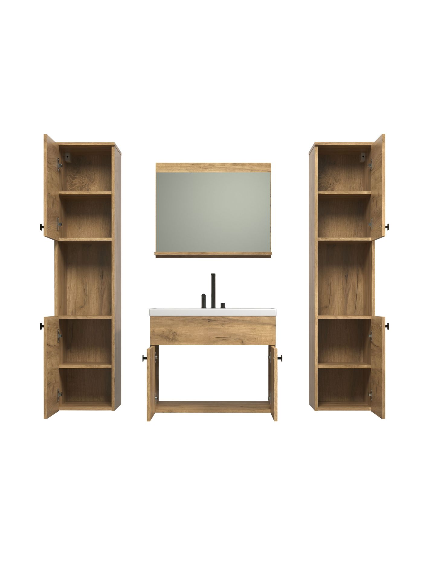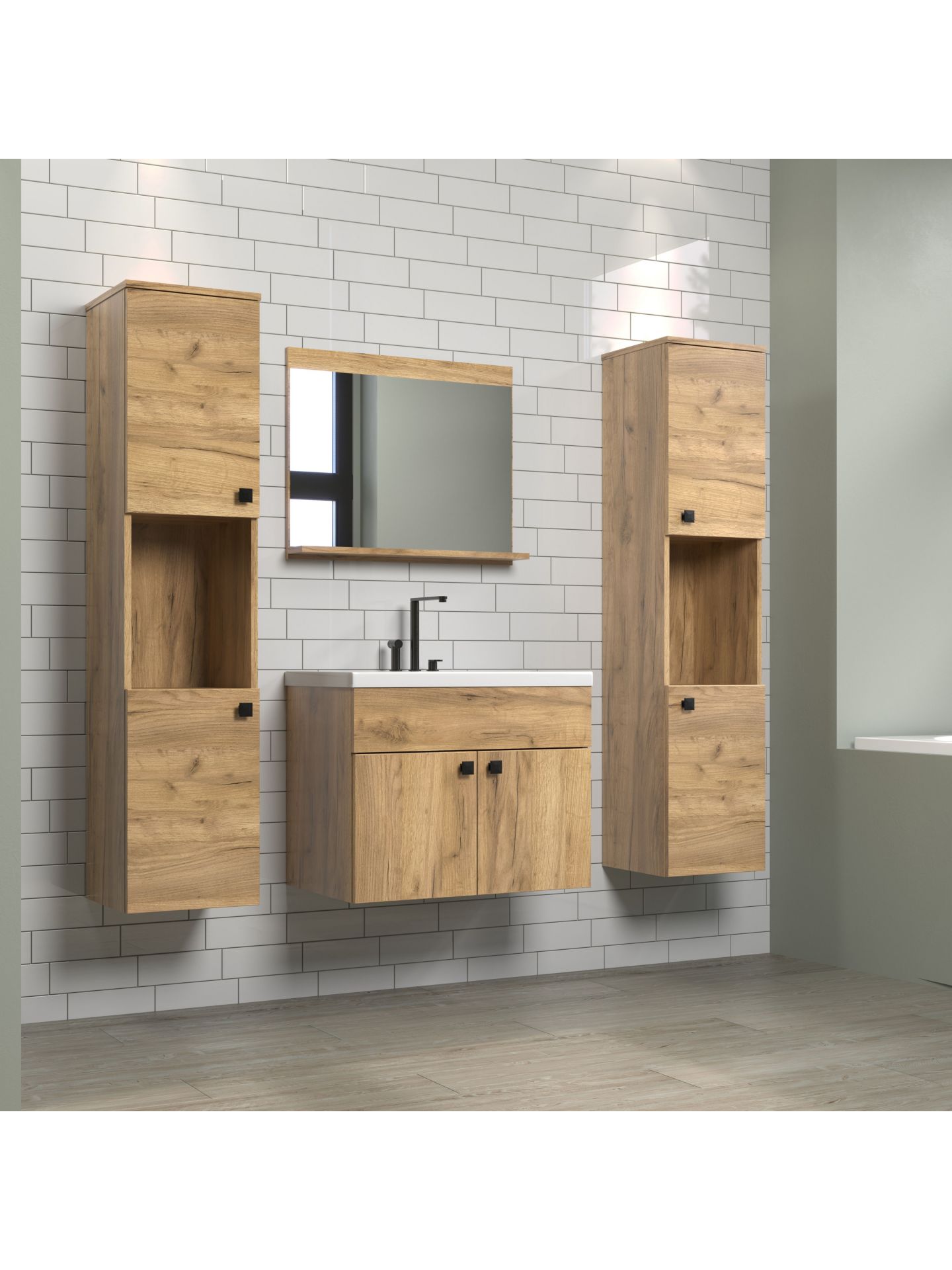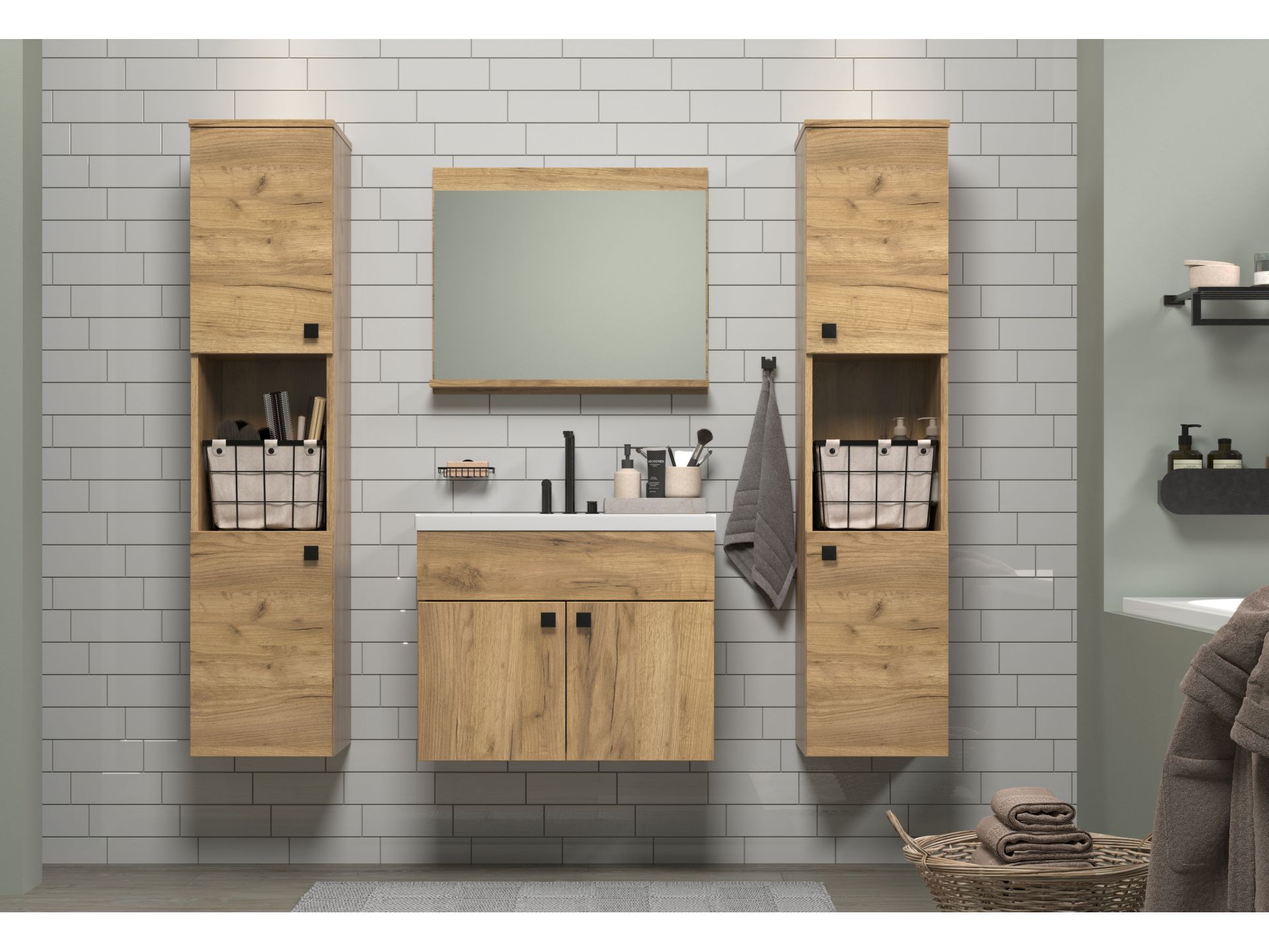 Das Badprogramm HAVEN in Holzoptik bringt ein Stück Natur ins Badezimmer. Mit seinen warmen Eiche-Dekoren und der klaren Linienführung schafft HAVEN eine Atmosphäre der Ruhe und Geborgenheit - perfekt für einen entspannten Start in den Tag oder einen gemütlichen Ausklang am Abend. Mit offenen Bereichen für die griffbereite Aufbewahrung von Handtüchern und Pflegeprodukten. Die elegante Hängemontage lässt das Bad großzügig und aufgeräumt wirken.
