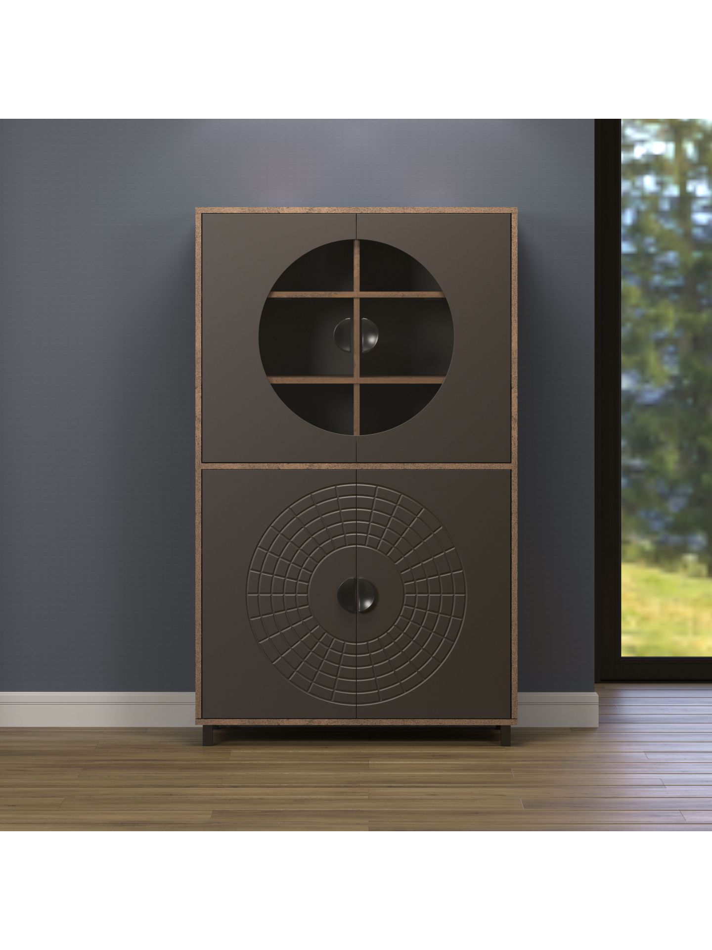 Die Wohnmöbelserie Fusion verbindet klare Formen mit einem markanten Design-Statement und wird so zum Blickfang in jedem modernen Wohnzimmer. Charakteristisches Highlight sind das hochwertig grafisch gefräste Kreismuster, das sich in allen Einzeltypen wiederfindet. In Kombination mit der warmen Holzoptik im Perlbronze Dekor und den ruhigen, dunklen Fronten in Rostoptik entsteht ein harmonischer Look: Von modern-minimalistisch bis urban gemütlich, die Serie Fusion ist ein optischer Hingucker in jedem Wohnzimmer.