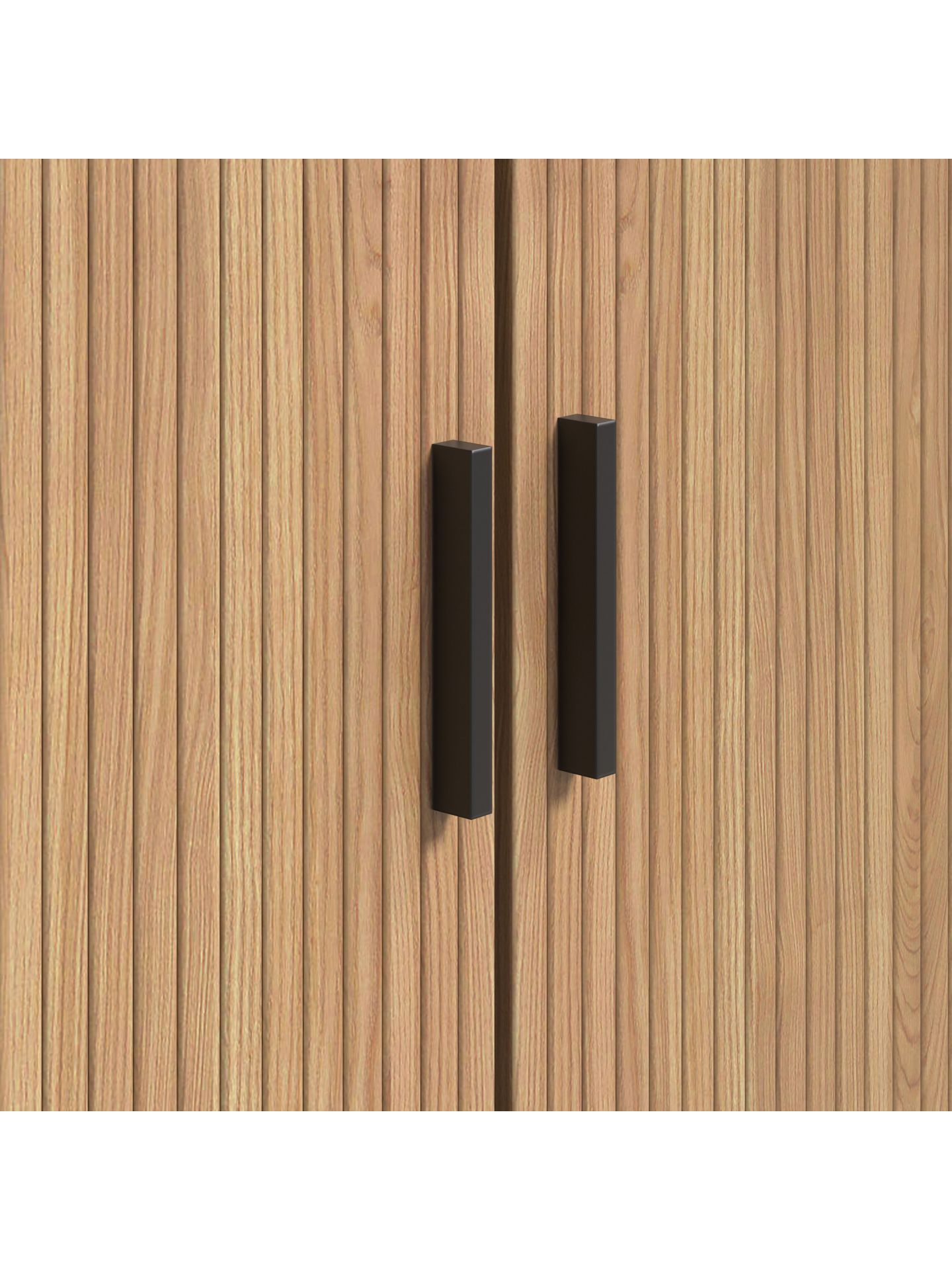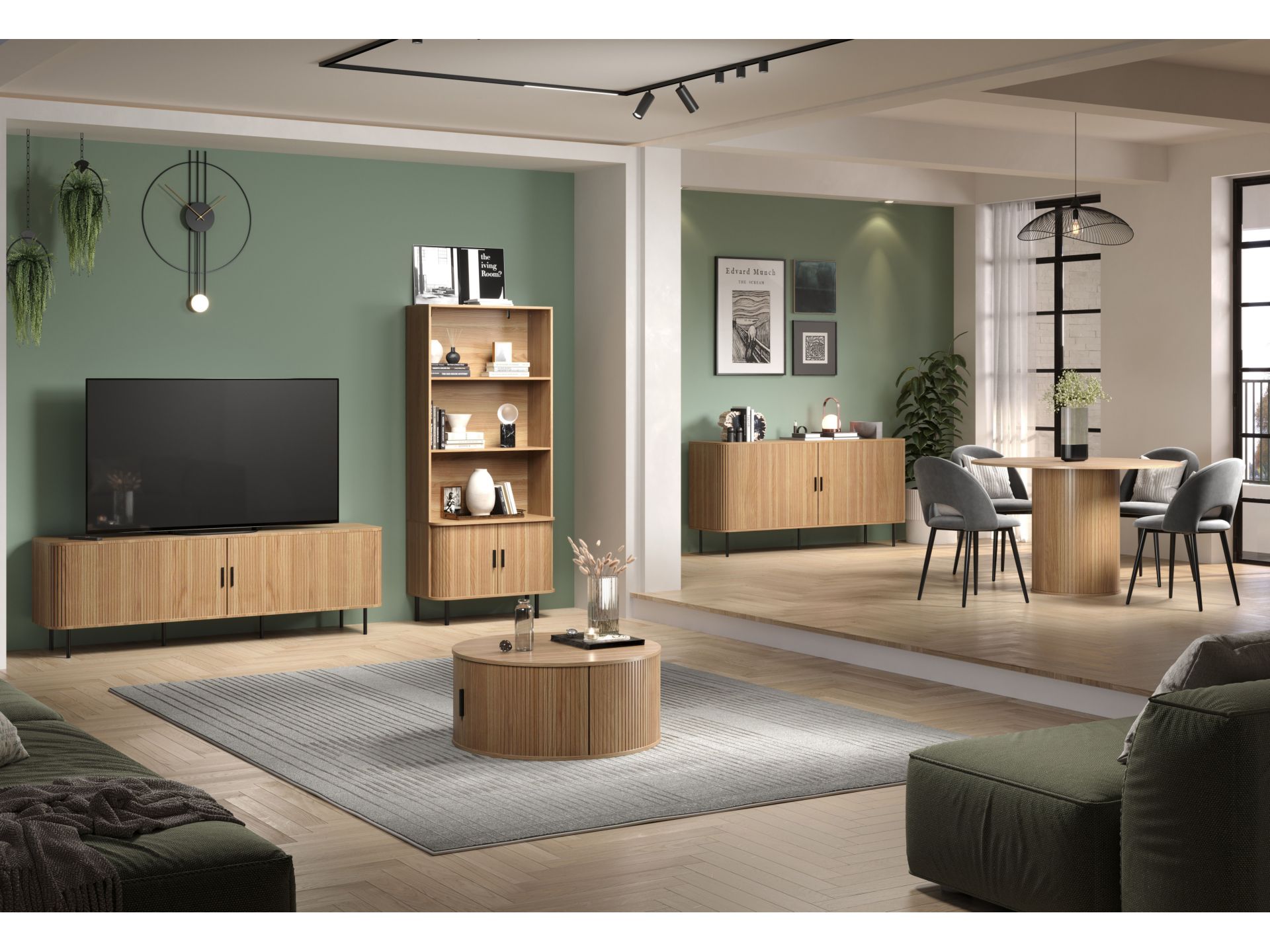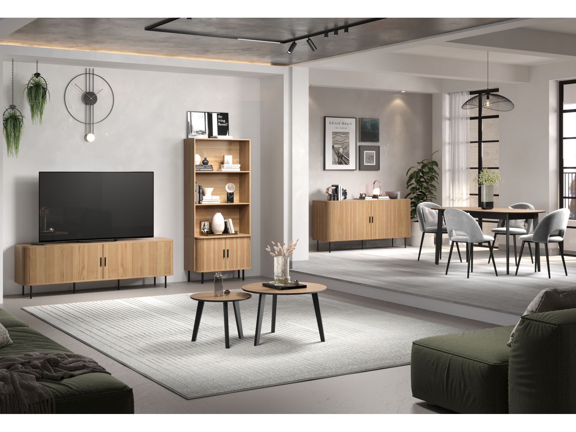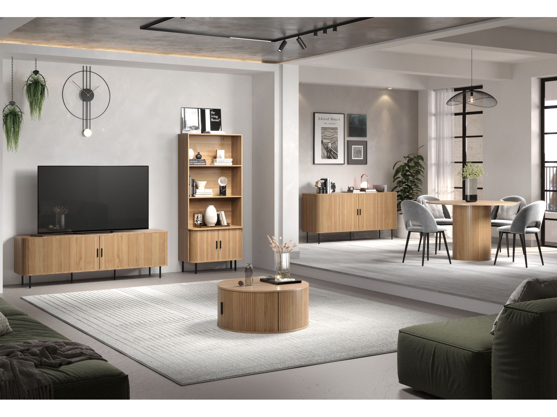 Das Wohnprogramm Ronin überzeugt durch sein reduziertes Design und die harmonische Kombination aus natürlicher Holzoptik und klarem Minimalismus. Die feine, vertikale Lamellenstruktur unterstreicht die Hochwertigkeit des Designs und gibt der Oberfläche eine besonders angenehme Haptik und visuelle Tiefe.