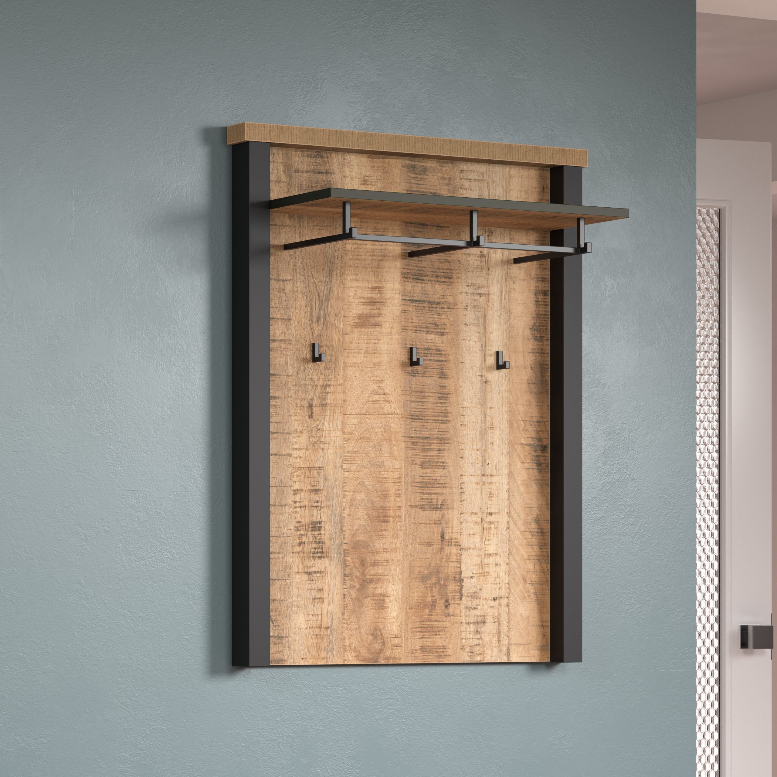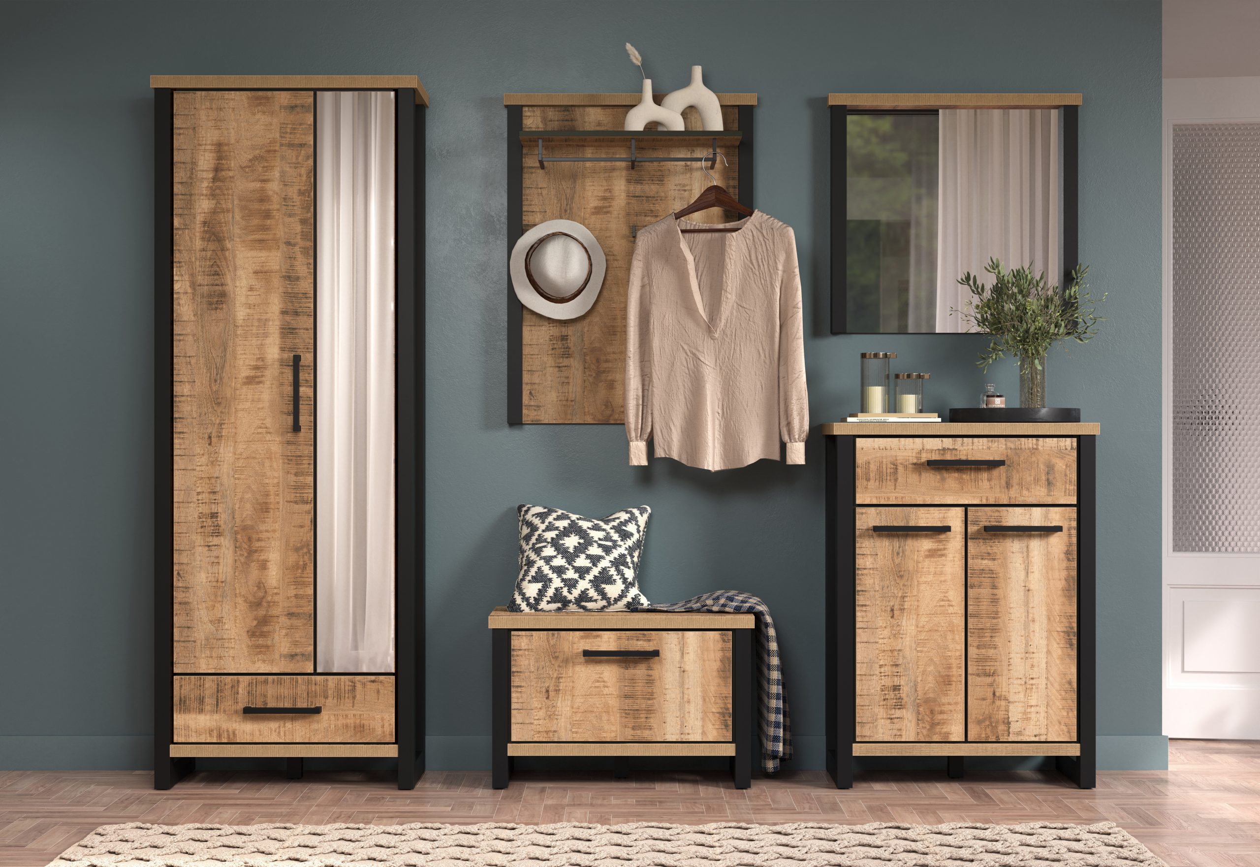 Willkommen zu Hause: Die stilvolle Garderobenserie ENNA vereint ein modernes Design mit rustikalem Charme. Klare Linien, markante Kontraste und warme Holzoptik machen diese Serie zum Blickfang in jedem Eingangsbereich.