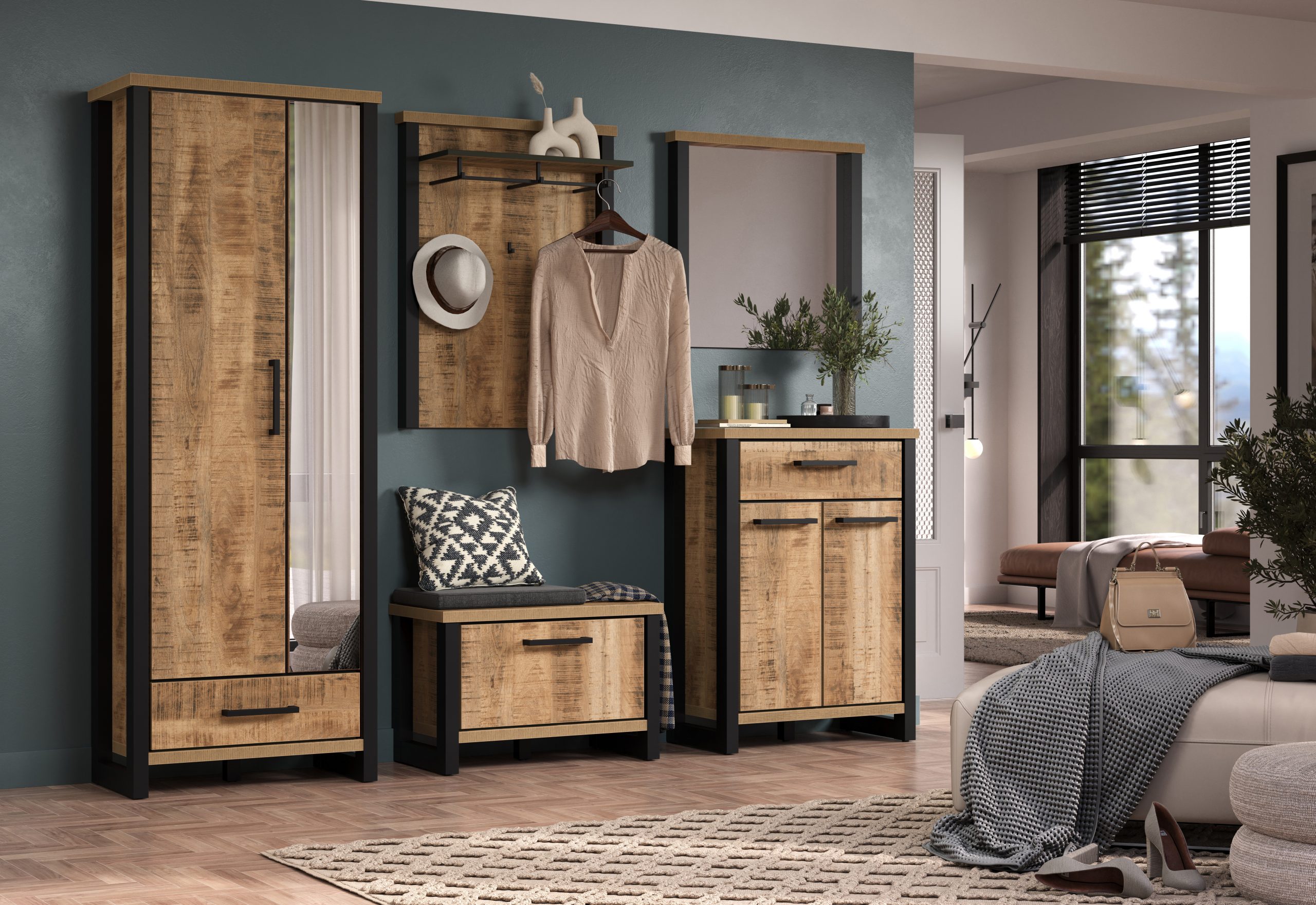 Natürliche Eleganz trifft hier auf Funktionalität: Die Fronten in authentischer Mangoholz-Optik sorgen für eine wohnliche Atmosphäre im Eingangsbereich, während die schwarz abgesetzten Rahmen und Griffe das markante Industrial Design einbringen. Jedes Element wirkt hochwertig und durchdacht – vom Garderobenschrank, der Kommode, der funktionalen Sitzbank bis hin zum Spiegel und großzügigen Wandpaneel.