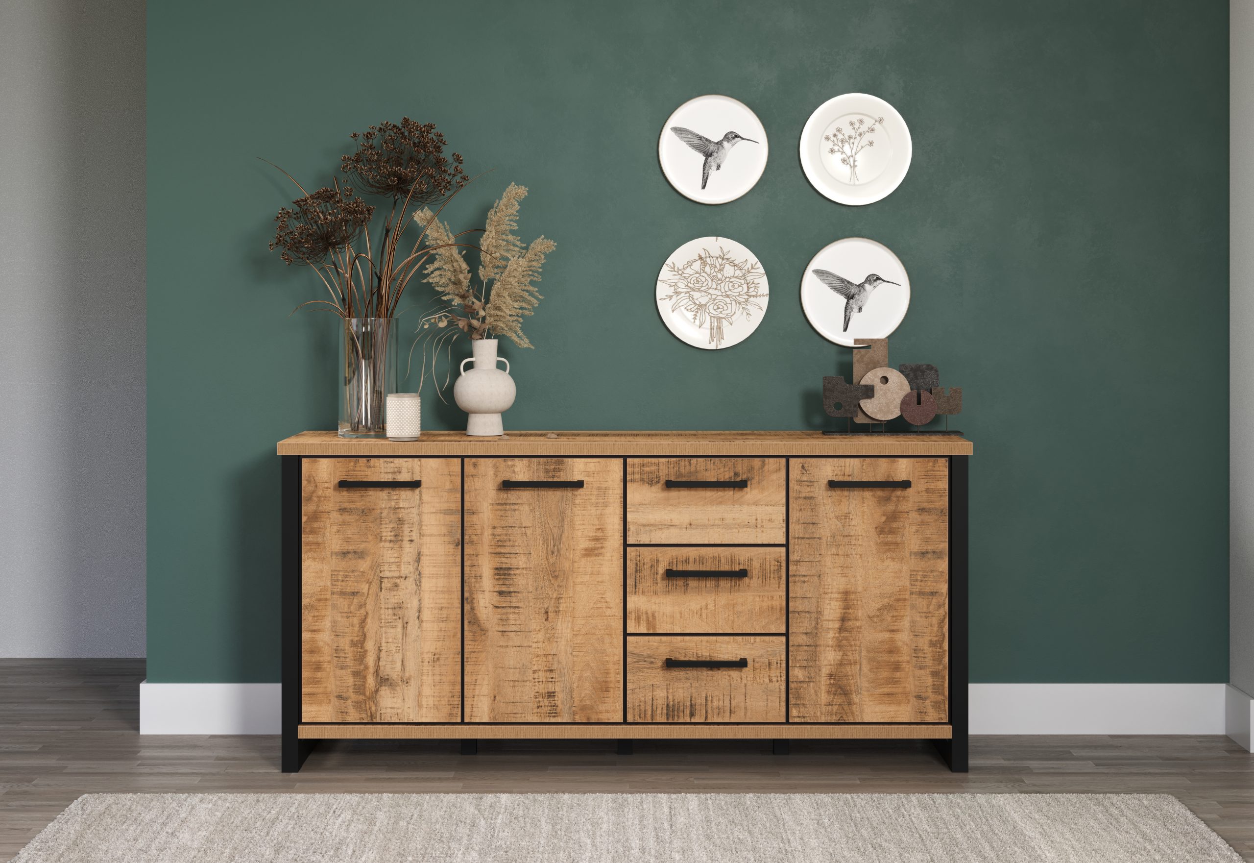 Die Möbel aus der Serie ENNA überzeugen nicht nur optisch, sondern auch durch hochwertige Verarbeitung und langlebige Materialien. Die robusten Oberflächen sind pflegeleicht und alltagstauglich, während das industrielle Design für ein harmonisches und wohnliches Gesamtbild sorgt. Abgerundet wird die Serie durch clevere Details wie die hochwertigen schwarzen Metallgriffe.