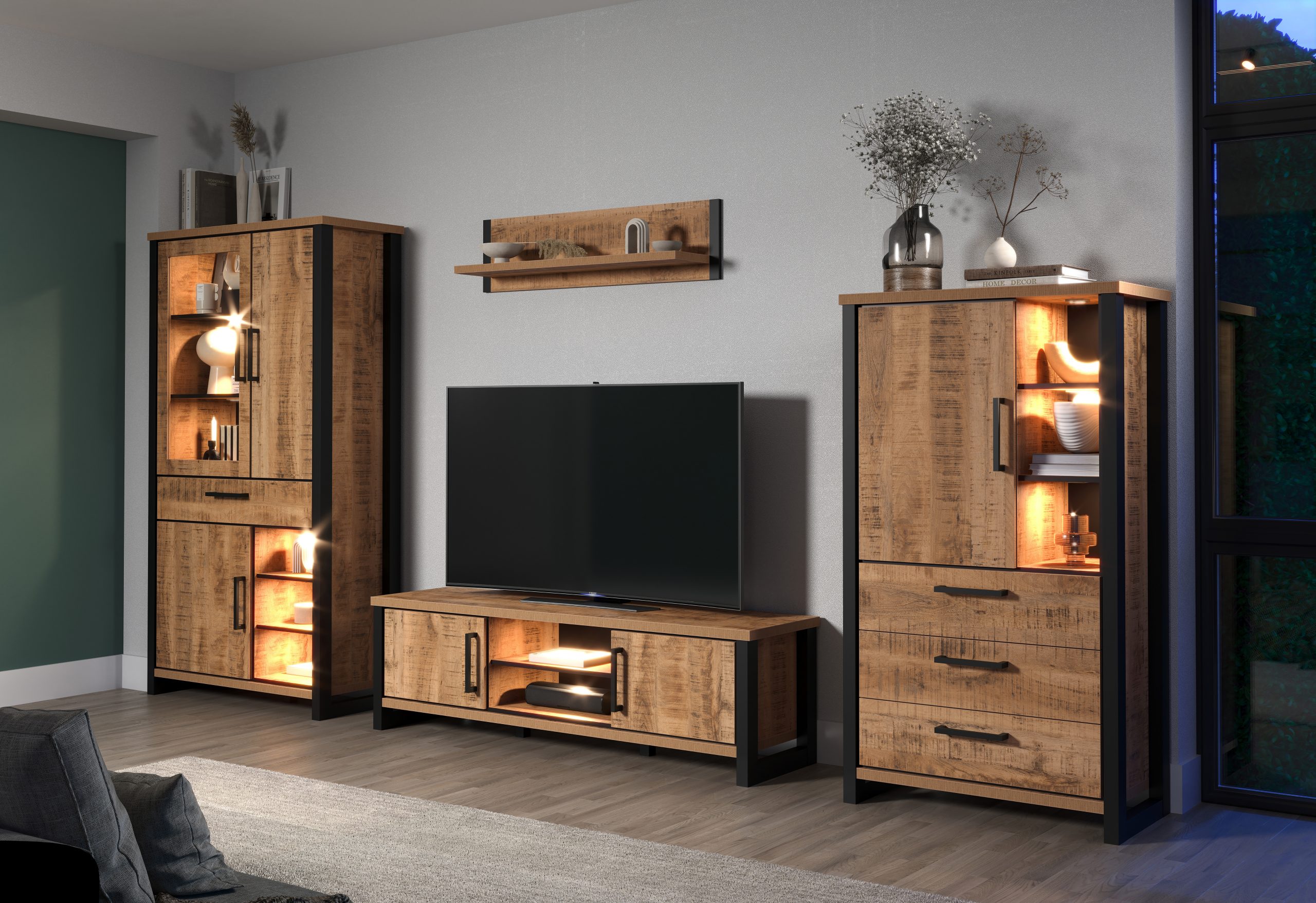 Die Serie ENNA vereint natürliche Holzoptik mit modernem Industrial Design und bringt so stilvolle Wohnzimmermöbel in dein Zuhause. Mit ihrer markanten Kombination aus warmem Mango Holzdekor, schwarzen Stollen und Metallgriffen sorgt ENNA für ein elegantes, urbanes Ambiente. Perfekt für alle, die den modernen amerikanischen Loft-Look lieben.